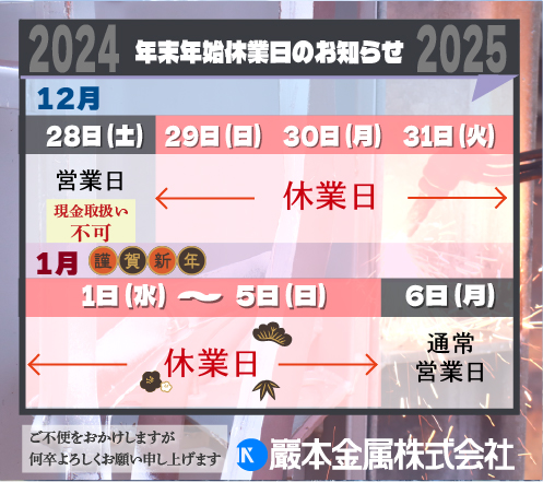 2024年 年末年始の営業時間と現金取扱時間のご案内 2024.11.25 カテゴリ:お知らせ Tweet 詳細PDFは下記よりご確認ください。 ⇩ ⇩ ⇩ ■京都工場/久御山工場/大阪工場についてはこちらをご覧ください。 ■栗東工場/愛知川工場/水口工場/岐阜工場/三重工場/福井工場/長浜工場についてはこちらをご覧ください。 ■東京営業所についてはこちらをご覧ください。 ■IKウェイスト株式会社についてはこちらをご覧ください。