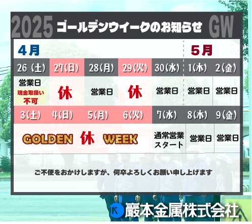 2025年 ゴールデンウイークの営業時間と現金取扱時間のご案内 2025.04.10 カテゴリ:お知らせ Tweet 2025年ゴールデンウイーク期間の営業についてお知らせいたします。 詳細PDFは下記よりご確認ください。 ⇩ ⇩ ⇩ ■京都工場/久御山工場/大阪工場についてはこちらをご覧ください。 ■栗東工場/愛知川工場/水口工場/岐阜工場/三重工場/福井工場/長浜工場についてはこちらをご覧ください。 ■東京営業所についてはこちらをご覧ください。 ■IKウェイスト株式会社についてはこちらをご覧ください。 皆様にはご不便をおかけいたしますが、ご了承くださいませ。